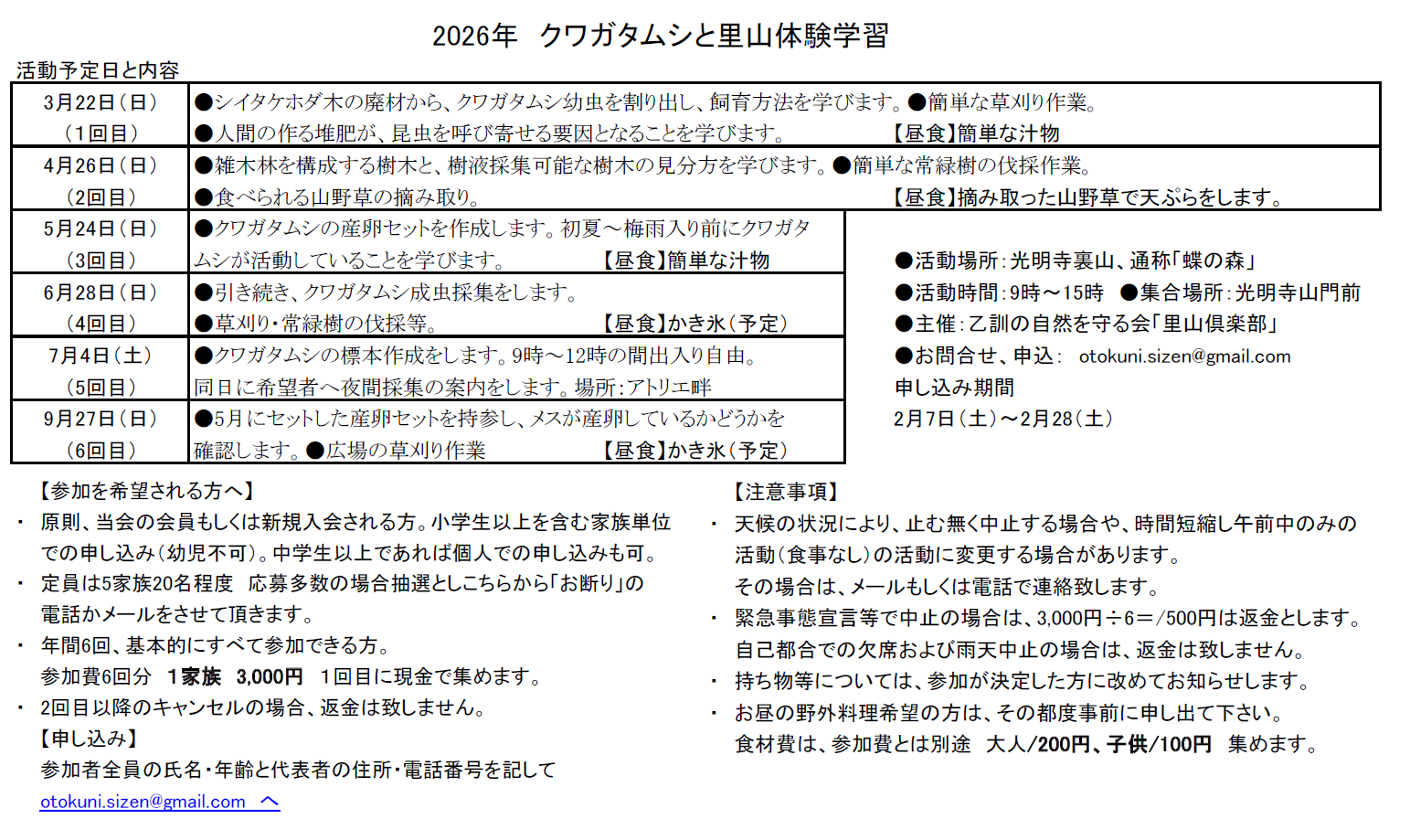 ▶服装持ち物:長袖長ズボン、帽子、蚊の対策、水筒